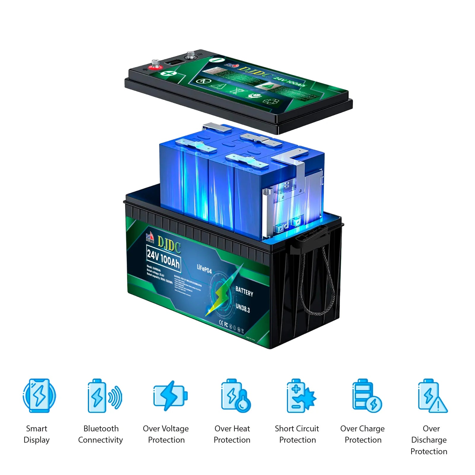 Upgrade your energy system with the DJDC 24V 100Ah LiFePO4 Battery, a compact and lightweight powerhouse designed for trolling motors, solar systems, RVs, kayaks, and more. Built with Grade-A prismatic cells and a 100A Smart BMS, this battery delivers long-lasting, safe, and efficient energy for all your adventures.